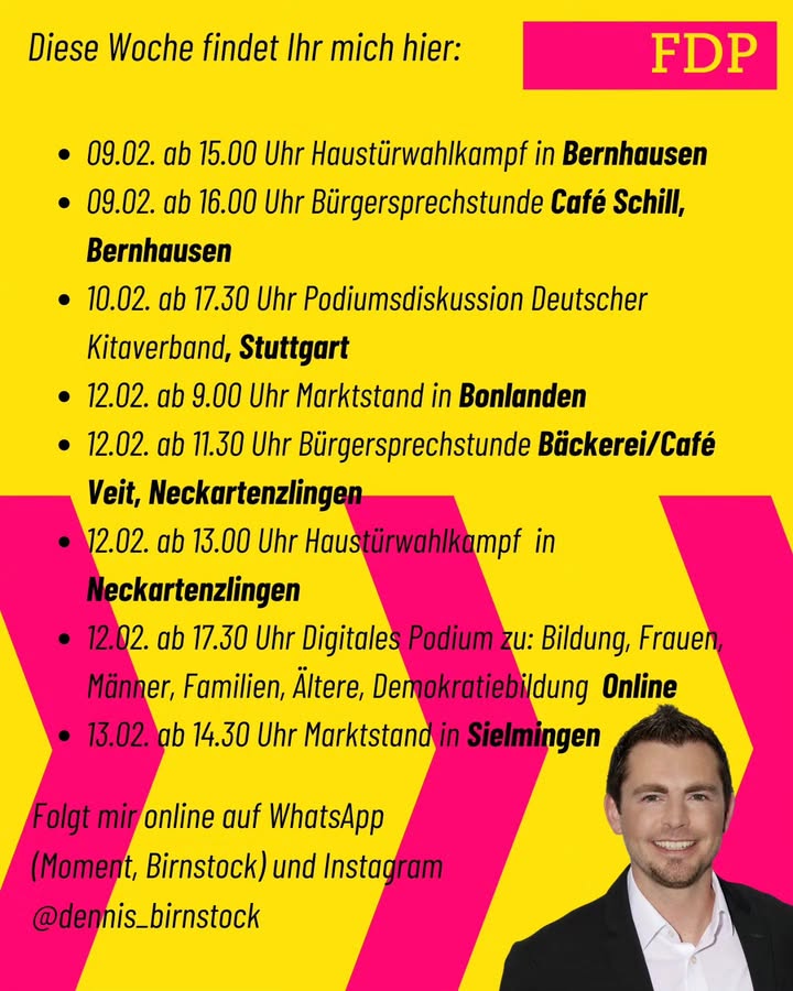 An diesen Stationen findet Ihr mich diese Woche. Kommt vorbei und kommt mit mir ins Gespräch! 😊 Ich freue mich auf Euch. 💛 #ZurückAufVorwärts #FDP #WKNürtingen #LTW2026