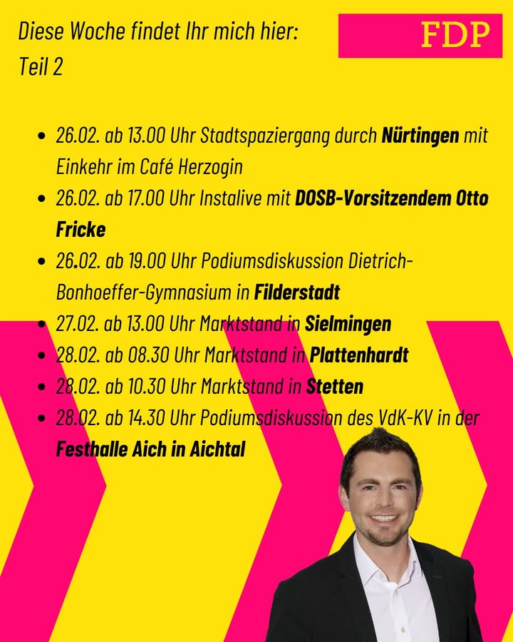 Und hier Teil 2 meiner restlichen Termine dieser Woche. Ich freue mich, wenn ich den ein oder anderen zum Gespräch treffe. Und seien wir mal ehrlich, ist das nicht ein herrliches Wetter heute für einen Spaziergang? Also Sonnenbrille auf und raus mit Euch. Heute Mittag in Nürtingen. 😉